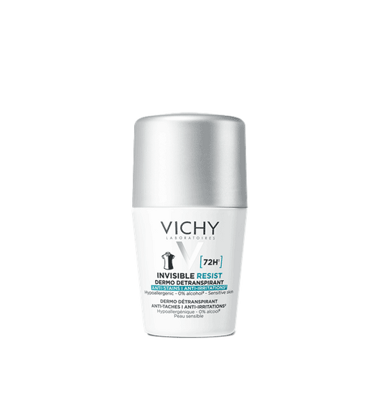 - De Vichy Invisible Resist 72h Anti-transpirant is speciaal ontwikkeld voor vrouwen. Hi j heeft een doeltreffende werking tegen vochtigheid en geurtjes en biedt optimale tolerantie dankzij zijn hypoallergene en alcoholvrije formule, getest op een gevoelige huid ter bescherming en tegen irritaties. Hij garandeert een hoge anti-transpiratiewerking gedurende maximaal 72 uur, met een langdurig parfum, zonder sporen achter te laten. De Invisi-Lock-technologie, goedgekeurd door het IFTH (Institut Français du Textile et de l’Habillement), zorgt ervoor dat er geen gele vlekken op licht textiel of witte vlekken op donker textiel verschijnen en voorkomt dat het deodorant resten achterlaat die kleding kunnen doen verstijven. De niet-vette en niet-plakkerige textuur maakt deodorant aangenaam om te dragen. De voordelen van de unieke en klinisch bewezen geavanceerde technologie zijn goedgekeurd door 90% van de gebruikers , die van mening zijn dat deze dermo-transpirant doeltreffend is tegen slechte en vochtigheid.