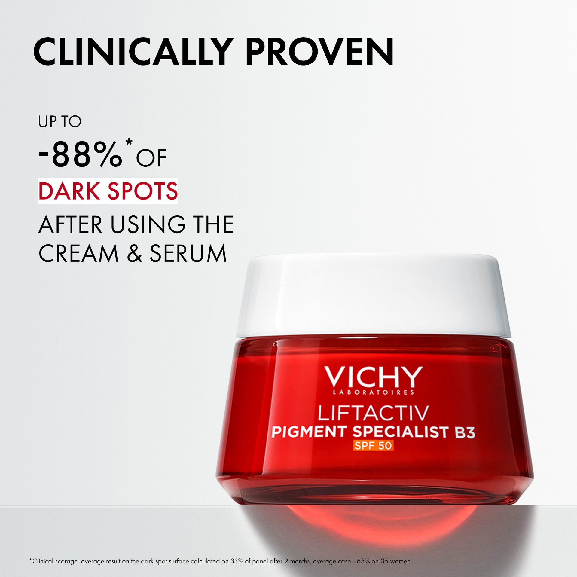 • LIFTACTIV PIGMENT SPECIALIST B3 SPF50 DAGCRÈME werkt tegen pigmentvlekken en rimpels met Niacinamide B3 en Melasyl.