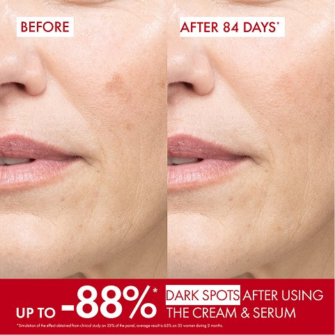 • Deze dagcrème met klinisch bewezen werking vervaagt alle soorten pigmentvlekjes en heeft ook een breedspectrum SPF50+-factor om de huid te beschermen tegen uv-stralen. Na verloop van tijd vervagen pigmentvlekken, de teint wordt egaler en rimpels worden gladder.